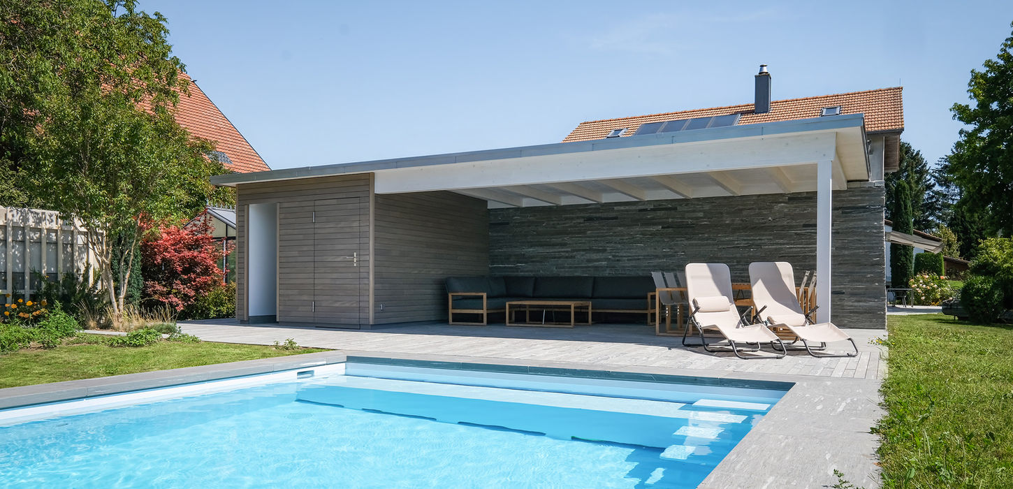 Der komplett aus Holz erstellte Flachbau bietet einen grosszügigen Schattenplatz mit Lounge und Essbereich sowie einen abgeschlossenen Teil mit Geräteraum und Nasszone. Rückseitig ist das Poolhaus mit einer Natursteinmauer als Sichtschutz ergänzt.